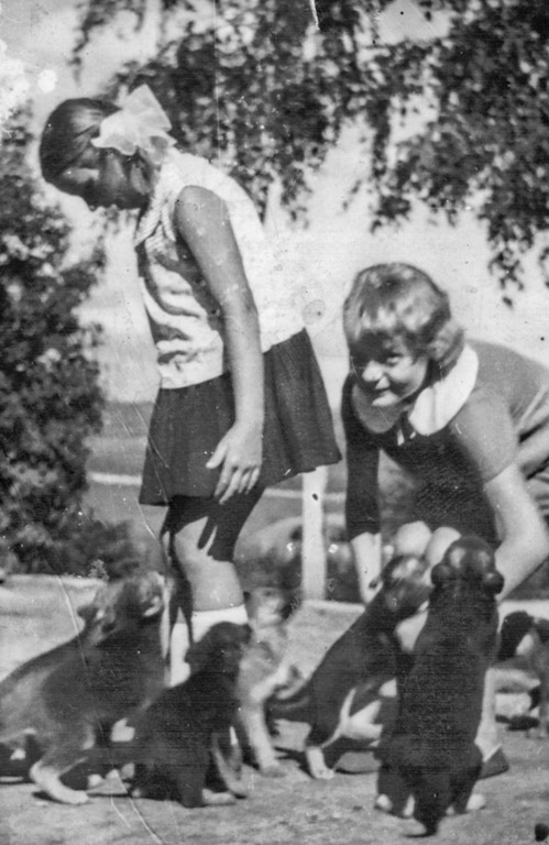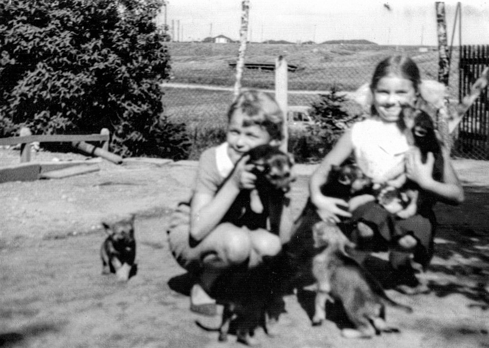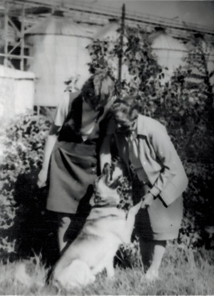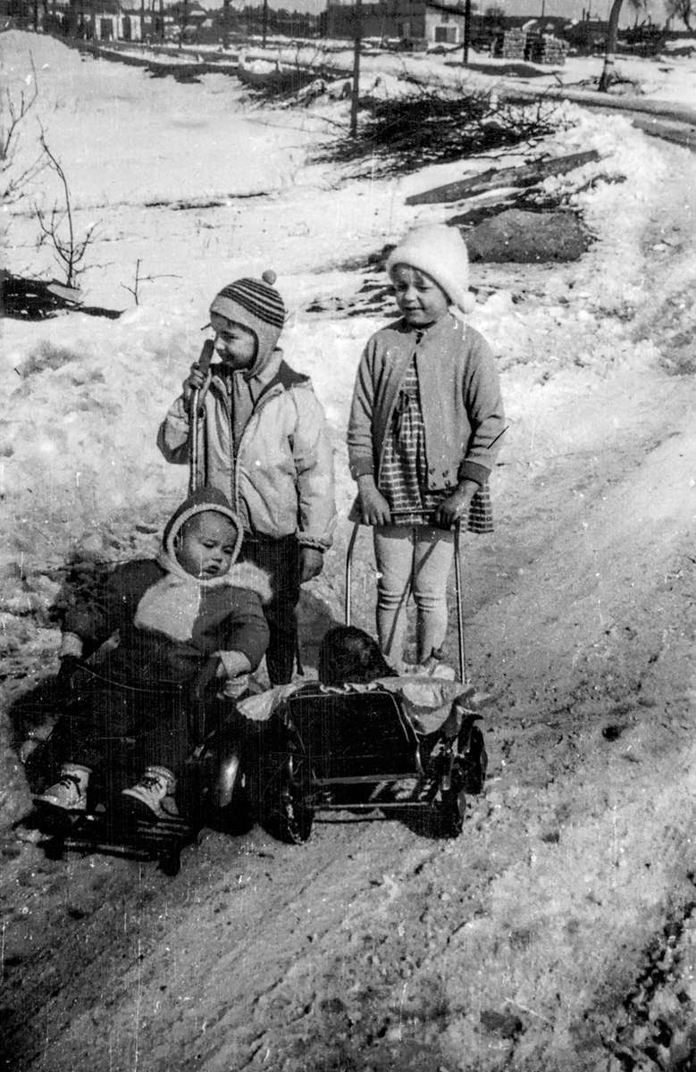 1. Ulica Dziadki Sołtyskie (wtedy) przy zakręcie, parę metrów przed naszym domem. W tle widać składnicę drewna. Ja pcham Jarka w wózku.